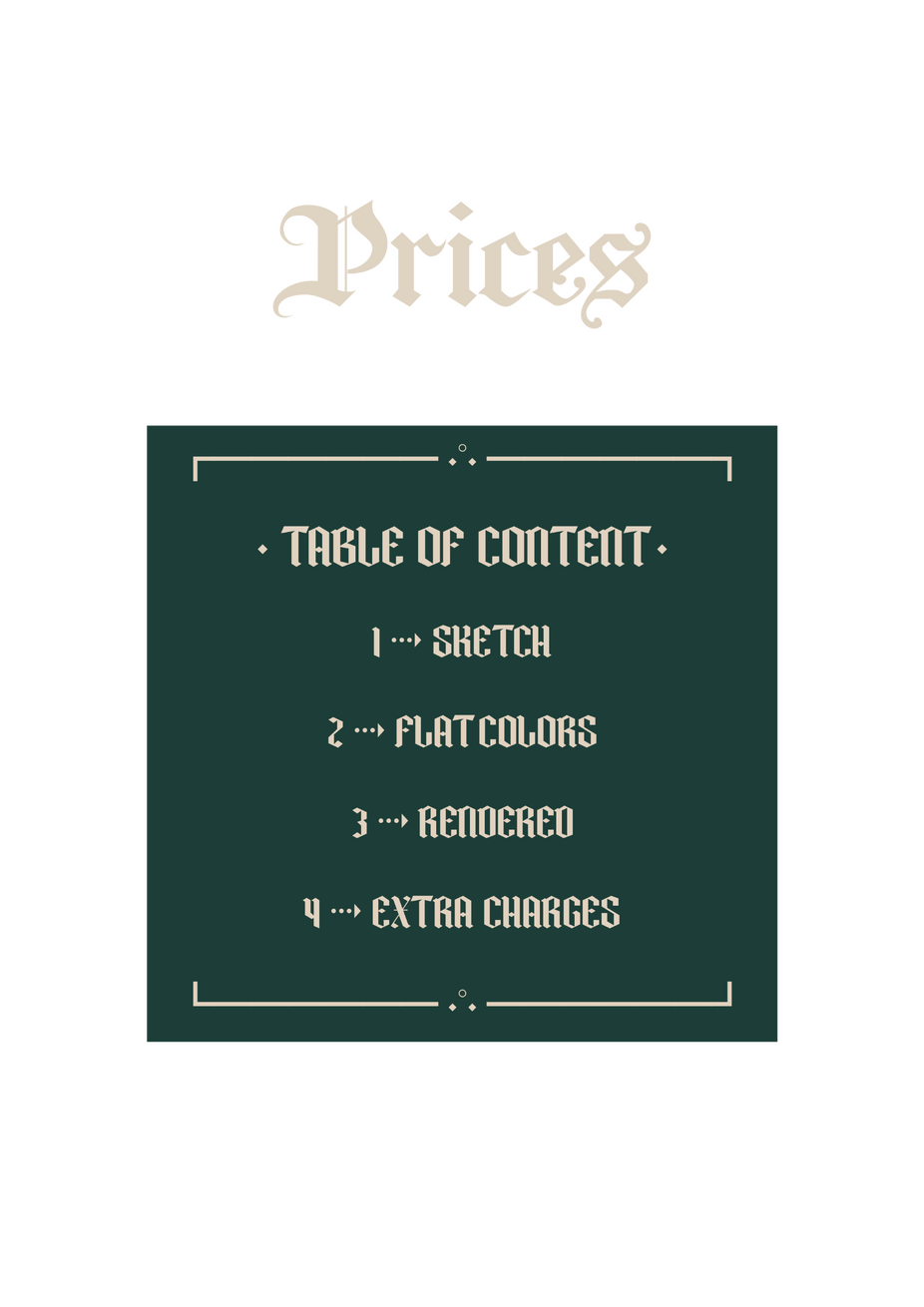 • Extra character ⇢ +85%• Props ⇢ +$10 - 50• Background ⇢ +$100• Custom design ⇢ +$15• Mecha ⇢ +60 - 100%• Gore/extreme body horror ⇢ +$15 - 30• NSFW ⇢ prices.• ─── • ─── •Characters must have at least one (preferably high quality) colored reference, if they don’t, then it’ll be considered a custom and therefore the commission will increase in price accordingly.Complexity fee may apply depending on the design of the character (such as extra limbs, horns, wings, too many accessories, etc), poses or angles.I will send WIP pictures of every stage (rough sketch, clean sketch, flat colors, shading and fully rendered) in case there are adjustments to be made, if you aprove the work and then change your mind in later stages or make excessively big changes, I might charge proportionally, so please plan your commission through.These are all base prices and are subject to change, for an exact quote please contact me privately with a description of the individual commission.• ────── •°• ────── •